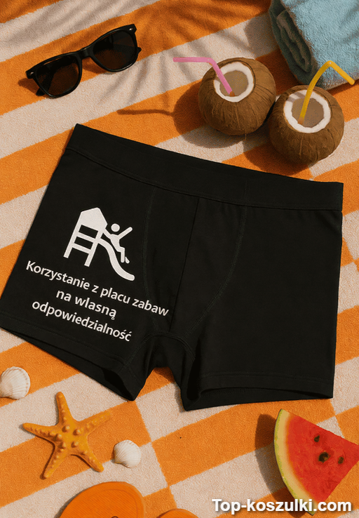 Śmieszne bokserki korzystanie z placu zabaw to prezent z ostrzeżeniem, którego nikt się nie spodziewa. Napis „Korzystanie z placu zabaw na własną odpowiedzialność” robi robotę od pierwszego spojrzenia 😄