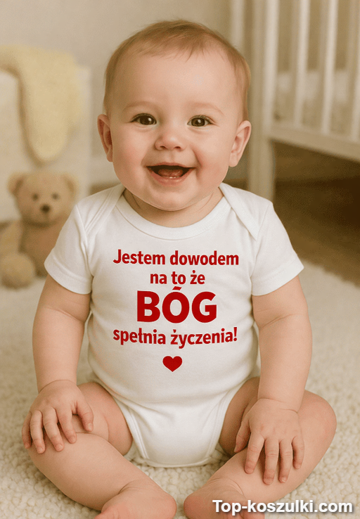 To śmieszne body niemowlęce prezent z tekstem „Jestem dowodem na to że BÓG spełnia życzenia!” robi robotę od pierwszego spojrzenia. Ma w sobie urok, odrobinę bezczelnego humoru i ten efekt: „Okej, kto to wymyślił?!” 😅