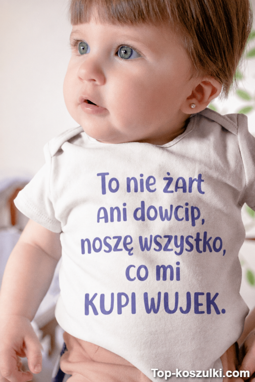 Jeśli szukasz czegoś, co rozbraja na starcie i robi z wujka bohatera spotkania, to śmieszne body niemowlęce prezent wujek jest strzałem w dziesiątkę. Napis „To nie żart ani dowcip, noszę wszystko, co mi KUPI WUJEK.” wywołuje śmiech, a jednocześnie puszcza oczko do całej rodziny 😉