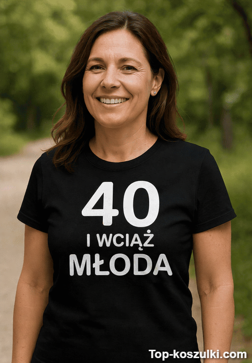 Śmieszna koszulka 40 lat młoda z hasłem „40 I WCIĄŻ MŁODA” to mały manifest wielkiej pewności siebie. Bo kiedy ktoś próbuje policzyć świeczki, ona już tańczy i wygląda jakby dopiero zaczynała najlepszy sezon życia 😉