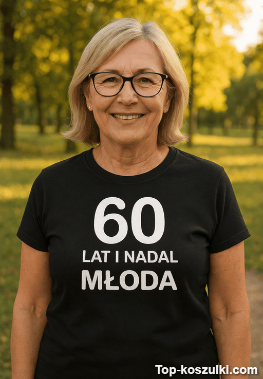 Śmieszna koszulka 60 lat nadal młoda to prezent, który mówi wszystko za Ciebie: „60 LAT I NADAL MŁODA”. Idealna dla kobiety z dystansem, która lubi błyszczeć na imprezie 😄