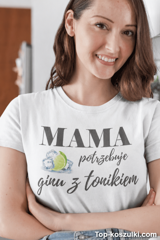 Śmieszna koszulka mama potrzebuje ginu mówi na głos to, co wiele osób myśli po całym dniu ogarniania świata. Napis „MAMA potrzebuje ginu z tonikiem” robi robotę od razu: jest bezczelnie zabawny, a jednocześnie totalnie „życiowy” 🍸