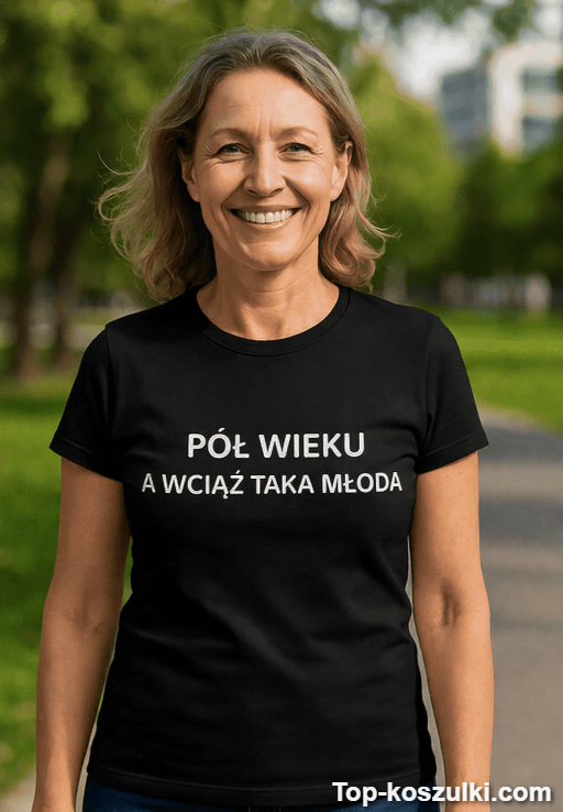 Śmieszna koszulka pół wieku wciąż młoda to idealny sposób, żeby 50-tka brzmiała jak komplement, a nie liczba. Napis „PÓŁ WIEKU A WCIĄŻ TAKA MŁODA” robi wejście na imprezę za Ciebie 😄