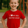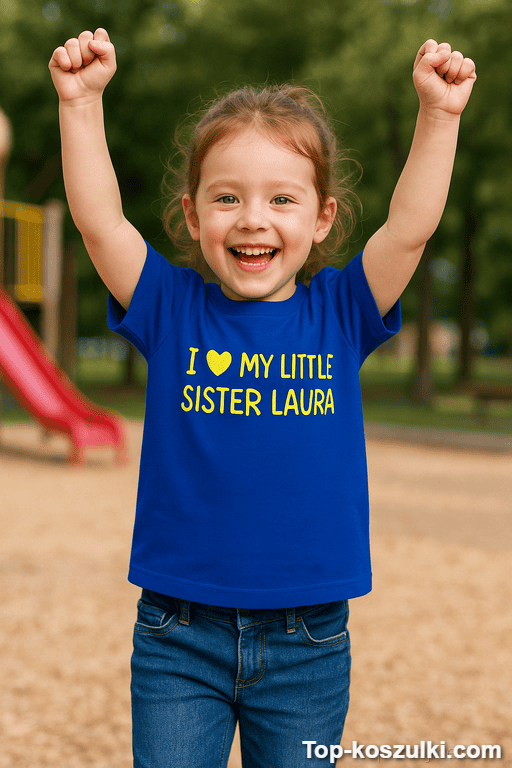 Koszulka dziecięca dla siostry z imieniem to mały manifest rodzeństwa: słodko, ale z charakterem. Napis w stylu „I ❤ MY LITTLE SISTER …” robi robotę od razu — jest uroczo, a jednocześnie lekko zaczepnie 😉