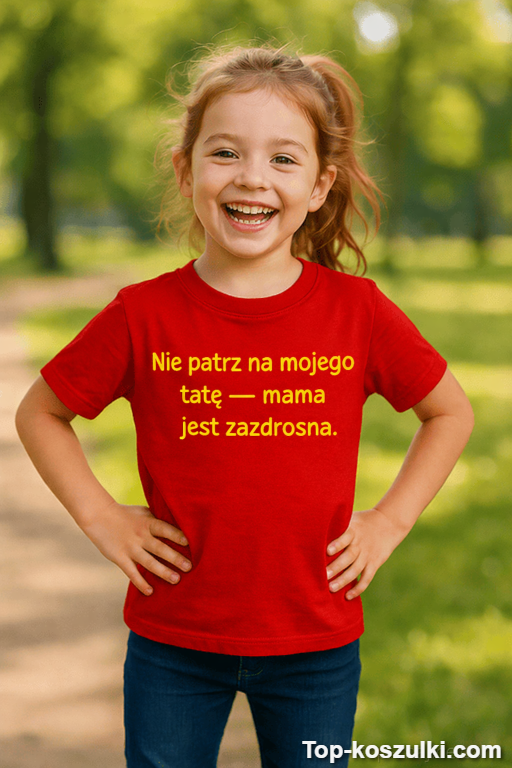 Szukasz prezentu, który od razu wywoła śmiech i zacznie rozmowy? Ta śmieszna koszulka dziecięca z napisem „Nie patrz na mojego tatę — mama jest zazdrosna.” to mały żart z wielkim efektem — lekko zadziorny, ale uroczy 😄