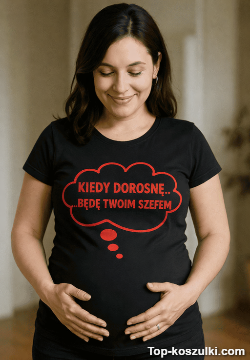 Śmieszna koszulka ciążowa kiedy dorosnę robi robotę od pierwszego spojrzenia. Napis „Kiedy dorosnę będę twoim szefem” to idealna zaczepka na rodzinne spotkania i zdjęcia z brzuszkiem 😉