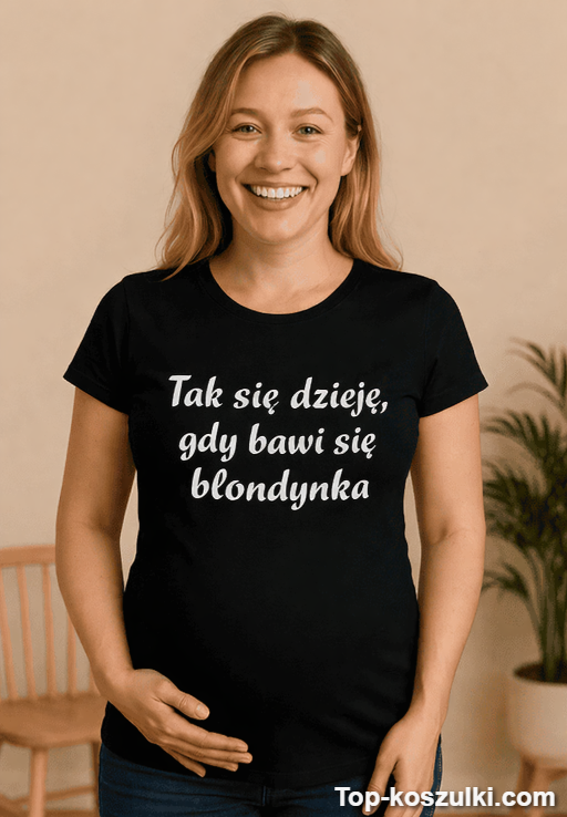 Jeśli szukasz czegoś, co od razu poprawia humor, ta śmieszna koszulka ciążowa blondynka robi robotę. Napis „Tak się dzieje, gdy bawi się blondynka” jest lekko zadziorny, totalnie memiczny i świetnie podkręca atmosferę na zdjęciach 📸