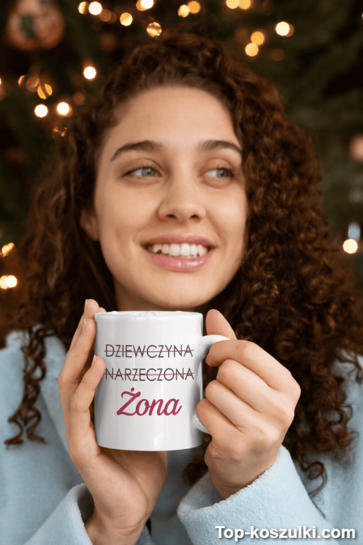 Śmieszny kubek prezent dla żony, który mówi wszystko bez jednego wykładu. Napis „DZIEWCZYNA NARZECZONA Żona” to mała oś czasu Waszej historii — z dużą dawką humoru 😄