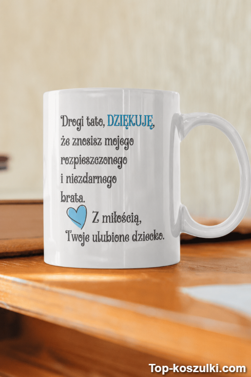 Śmieszny kubek ulubione dziecko taty mówi to, co zwykle zostaje w myślach: „Drogi tato, DZIĘKUJĘ, że znosisz mojego rozpieszczonego i niezdarnego brata… Z miłością, Twoje ulubione dziecko.” 💙 To humor, który trafia prosto w rodzinne realia i wywołuje ten rodzaj śmiechu, po którym tata tylko kręci głową i sięga po kolejny łyk.