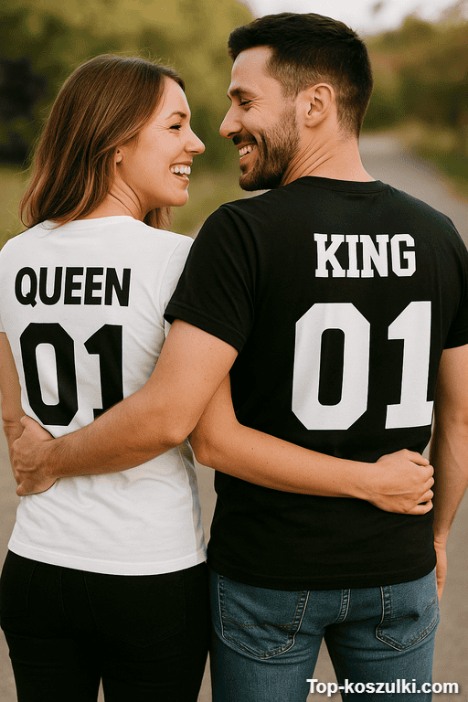 Koszulka dla par king queen z nadrukiem KING 01 / QUEEN 01 to mały manifest wielkiej relacji. Trochę bezczelna, bardzo zabawna i idealna, gdy chcecie wejść na imprezę jak własny duet VIP 😎