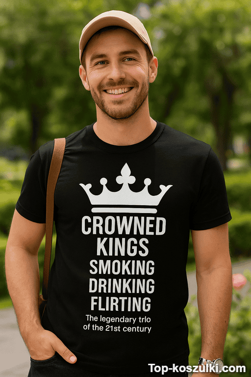 Śmieszna koszulka 3 kings to idealny wybór, gdy chcesz rozkręcić klimat bez tłumaczenia żartu. „CROWNED KINGS SMOKING DRINKING FLIRTING – The legendary trio of the 21st century” brzmi jak motto ekipy, która nie pyta o pozwolenie — tylko robi wejście 😎👑