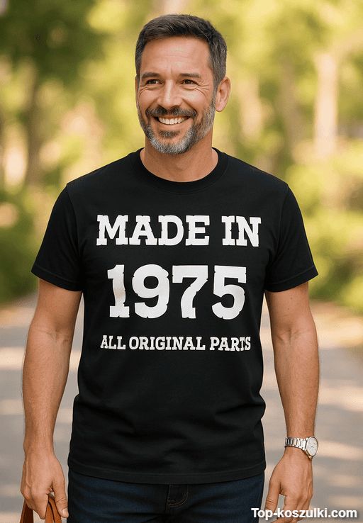 Jeśli ma być zabawnie, trochę zadziornie i bez nadęcia, ta śmieszna koszulka prezent urodzinowy robi robotę od razu. Napis „MADE IN 1975 ALL ORIGINAL PARTS” brzmi jak dumny certyfikat: klasyk, który się nie poddaje 😉