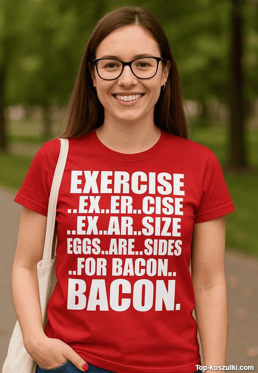 Śmieszna koszulka bacon z tekstem „EXERCISE… EGGS ARE SIDES FOR BACON… BACON.” to mały manifest wielkiej miłości do bekonu. To ten typ żartu, który rozbraja w kolejce po kawę i natychmiast zdradza, kto tu ma priorytety 😉