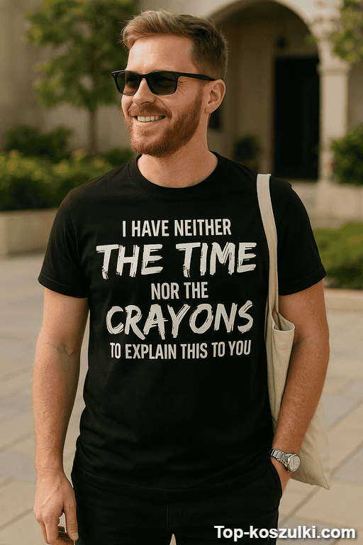Śmieszna koszulka crayons z hasłem „I HAVE NEITHER THE TIME NOR THE CRAYONS TO EXPLAIN THIS TO YOU” to Twój subtelny (no dobra, prawie subtelny) sygnał, że nie każdą rozmowę da się uratować. Zakładasz i nagle wszyscy rozumieją, że dziś nie ma miejsca na tłumaczenie oczywistości 😉