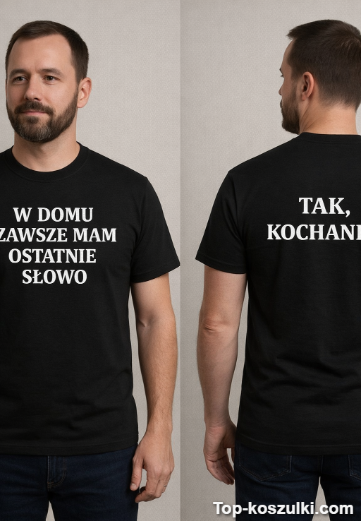 Szukasz czegoś, co rozkręci atmosferę szybciej niż toast? Ta śmieszna koszulka dwustronna prezent ma dwa tryby: SPREDAJ – „W domu zawsze mam ostatnie słowo” i ZADAJ – „Tak, kochanie”. Wystarczy odwrócić się plecami i już wiadomo, kto tu naprawdę wygrał dyskusję 😉