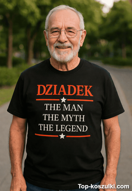 Śmieszna koszulka dziadek prezent, która mówi wszystko za Ciebie: „DZIADEK THE MAN THE MYTH THE LEGEND”. Idealna, gdy chcesz go rozbroić śmiechem i jednocześnie dać mu tytuł, na który zasłużył 😄