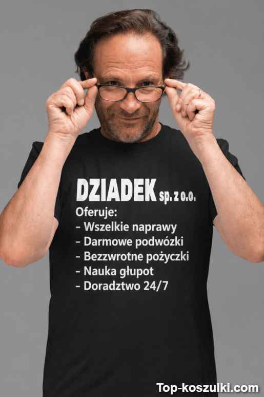 Jeśli szukasz czegoś, co rozbawi całą rodzinę i jednocześnie będzie trafione w punkt, ta śmieszna koszulka dziadek prezent robi robotę. „DZIADEK sp. z o.o.” brzmi jak poważny biznes, ale oferta na nadruku szybko zdradza, że to korpo z sercem i dystansem 😉
