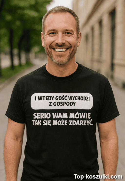 Śmieszna koszulka gość gospoda z hasłem „I WTEDY GOŚĆ WYCHODZI Z GOSPODY SERIO WAM MÓWIĘ TAK SIĘ MOŻE ZDARZYĆ.” to gotowy żart w wersji do noszenia. Niby niemożliwe, a jednak każdy zna kogoś, komu „prawie się udało” — i właśnie o to chodzi 😅