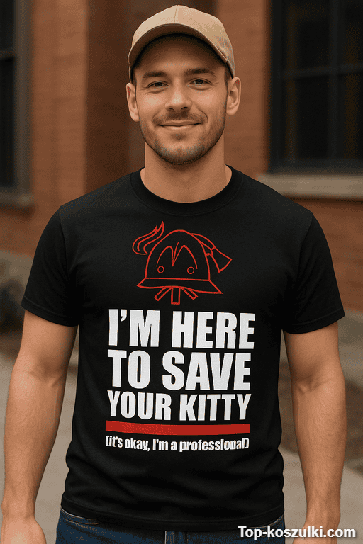Ta śmieszna koszulka I’m here to save your kitty mówi wszystko za Ciebie: wchodzisz, rzucasz tekst i nagle wszyscy się uśmiechają. Dwuznaczny żart jest na tyle grzeczny, żeby przejść w towarzystwie, i na tyle bezczelny, żeby zrobić efekt „oho!” 😄