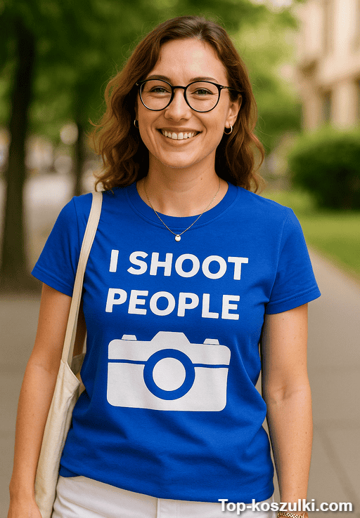 Ta śmieszna koszulka fotograf z napisem „I shoot people” to żart, który działa szybciej niż migawka. Dwuznaczność jest idealna: najpierw lekkie „oho…”, a sekundę później śmiech, gdy wszyscy łapią, że chodzi o zdjęcia 📸.