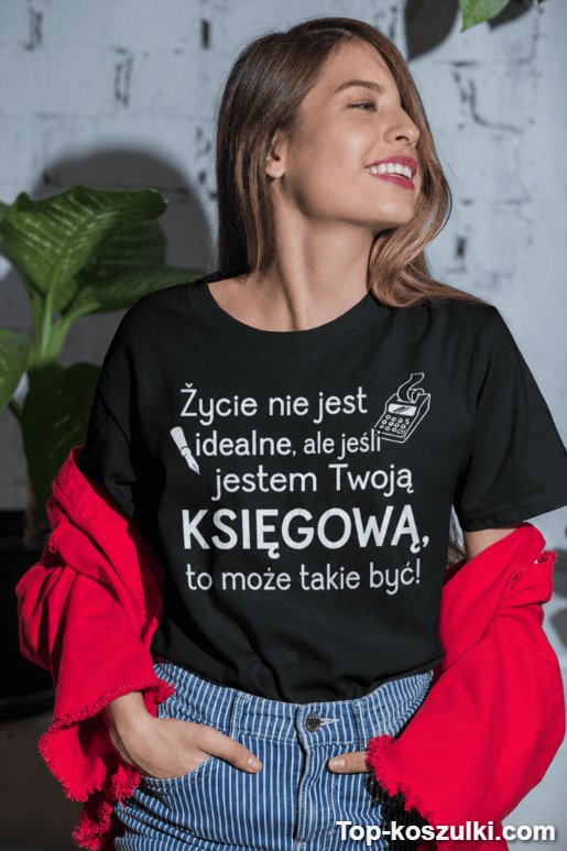 Szukasz prezentu, który rozbawi i jednocześnie będzie małą, uroczą „pochwałą” za ogarnianie chaosu? Ta śmieszna koszulka księgowa prezent z tekstem „Życie nie jest idealne, ale jeśli jestem Twoją KSIĘGOWĄ, to może takie być!” robi robotę od pierwszego spojrzenia 😄