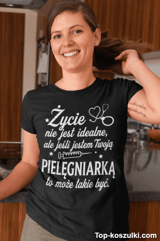 Szukasz czegoś, co bawi i jednocześnie mówi: „ufaj mi, ogarniam”? Ta śmieszna koszulka pielęgniarka prezent ma tekst, który trafia w punkt: „Życie nie jest idealne, ale jeśli jestem Twoją PIELĘGNIARKĄ to może takie być.” 😎