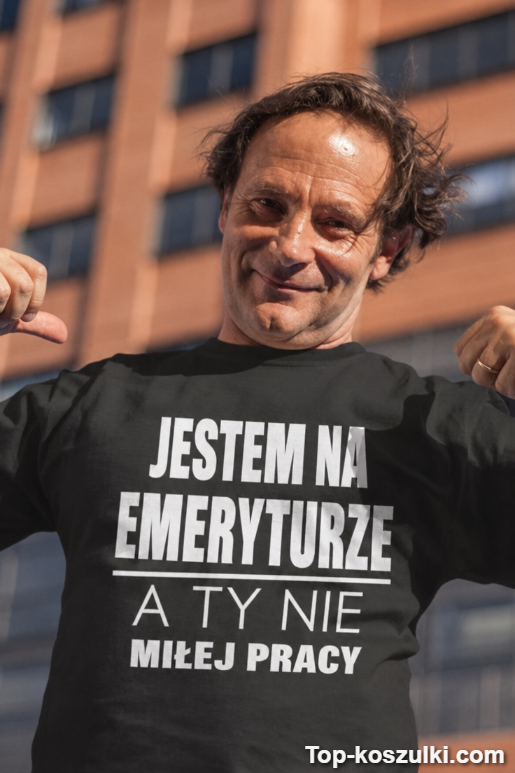 Jeśli szukasz czegoś, co rozbraja od pierwszego spojrzenia, ta śmieszna koszulka emerytura prezent robi robotę. Napis „JESTEM NA EMERYTURZE A TY NIE MIŁEJ PRACY” jest bezczelnie zabawny i dokładnie taki, jak powinien być emerycki humor 😄