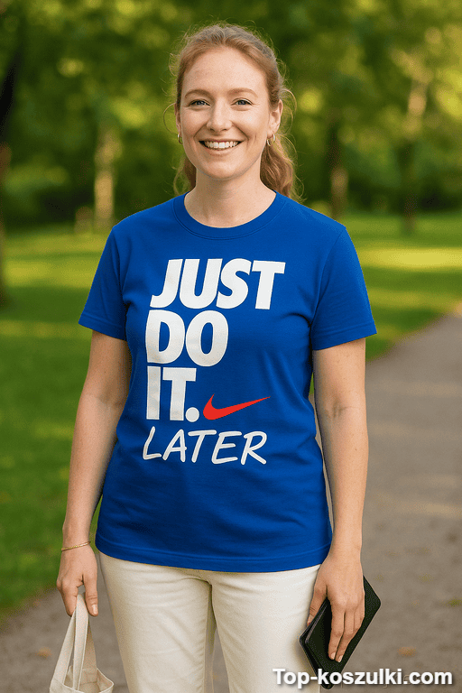Śmieszna koszulka just do it later z hasłem JUST DO IT. LATER to mały manifest dla tych, którzy działają w swoim tempie. Trochę bezczelna, bardzo prawdziwa i gwarantuje uśmiech szybciej niż „deadliny”. 😄