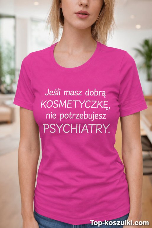Śmieszna koszulka kosmetyczka psychiatra to mały manifest: czasem najlepsza terapia zaczyna się w fotelu u kosmetyczki. Nadruk „Jeśli masz dobrą KOSMETYCZKĘ, nie potrzebujesz PSYCHIATRY.” trafia w punkt i wywołuje uśmiech szybciej niż kawa o poranku. 😉