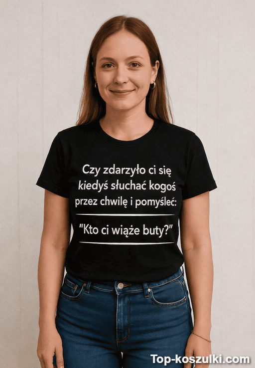 Śmieszna koszulka kto ci wiąże buty mówi za Ciebie to, czego czasem nie wypada powiedzieć na głos. Napis: „Czy zdarzyło ci się kiedyś słuchać kogoś przez chwilę i pomyśleć: ‘Kto ci wiąże buty?’” trafia w punkt, gdy rozmowa robi się… zbyt pewna siebie 😉