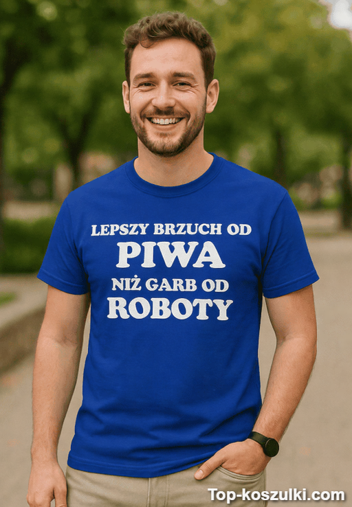 Śmieszna koszulka brzuch od piwa, która mówi na głos to, co wszyscy myślą po pracy. Napis „LEPSZY BRZUCH OD PIWA NIŻ GARB OD ROBOTY” robi klimat na imprezie i wywołuje uśmiech od pierwszego spojrzenia 😄
