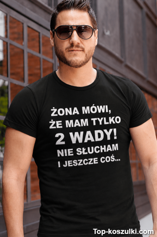 Śmieszna koszulka mam tylko 2 wady to ten typ żartu, który mówi wszystko bez tłumaczenia: „ŻONA MÓWI, ŻE MAM TYLKO 2 WADY! NIE SŁUCHAM I JESZCZE COŚ…”. Jedno zdanie i już wiadomo, kto tu ma dystans do siebie (i do komentarzy w domu) 😉