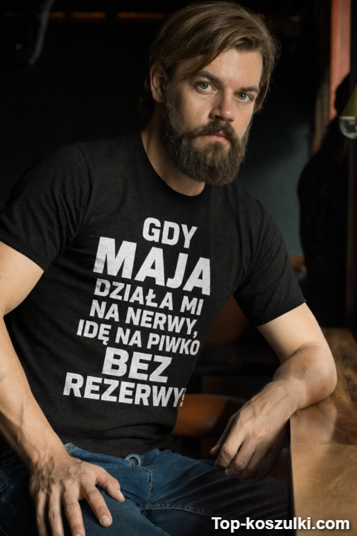 Jeśli szukasz czegoś, co rozładowuje napięcie jednym zdaniem, śmieszna koszulka nerwy piwko prezent jest strzałem w dziesiątkę. Napis „GDY MAJA DZIAŁA MI NA NERWY, IDĘ NA PIWKO BEZ REZERWY!” trafia w punkt: krótko, dosadnie i z humorem, który każdy zrozumie 🍺