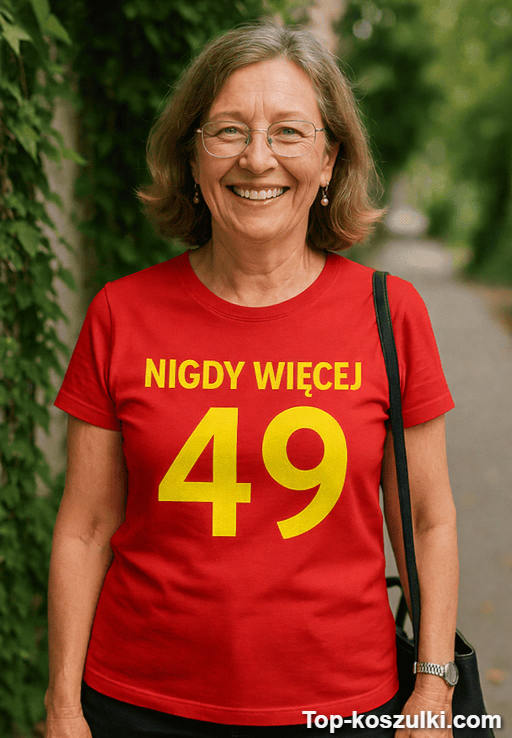 Śmieszna koszulka nigdy więcej 49 to tekst, który od razu wywołuje uśmiech i prowokuje pytanie: „To ile teraz?” 😄 Napis „NIGDY WIĘCEJ 49” jest bezczelnie zabawny, ale wciąż w dobrym guście — idealny na zdjęcia i toasty.