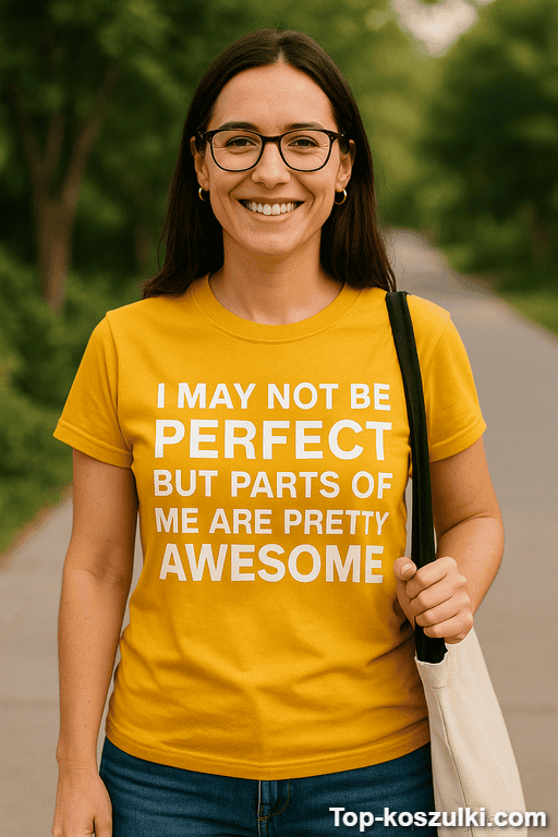 Śmieszna koszulka not perfect awesome to idealna odpowiedź na perfekcjonizm — z przymrużeniem oka i bez tłumaczeń. Tekst „I MAY NOT BE PERFECT BUT PARTS OF ME ARE PRETTY AWESOME” robi robotę: rozbraja i podkręca pewność siebie 😄