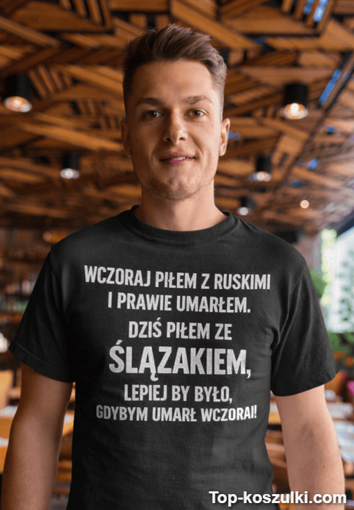 A jeśli potrzebujesz pewniaka na prezent, ta śmieszna koszulka „piłem z Ruskimi i Ślązakiem” działa jak dowcip opowiedziany w idealnym momencie: krótko, mocno i zostaje w pamięci 🍻
