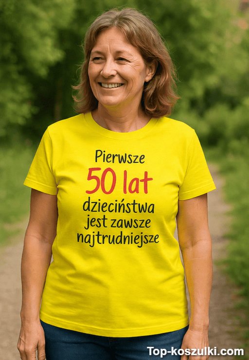 Śmieszna koszulka 50 lat, która mówi to, co wszyscy myślą, ale nie każdy odważy się powiedzieć na głos. Napis „Pierwsze 50 lat dzieciństwa jest zawsze najtrudniejsze” robi wejście na imprezę za Ciebie 😄