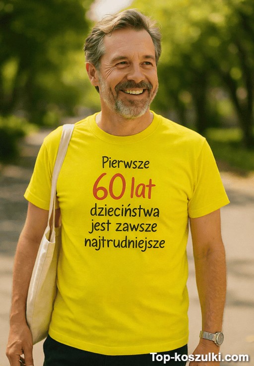 Ta śmieszna koszulka 60 lat to idealny tekst na wejście w nową dekadę z przytupem. Hasło „Pierwsze 60 lat dzieciństwa jest zawsze najtrudniejsze” rozbraja, bo trafia w punkt — i od razu ustawia klimat na śmiech.
