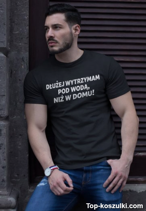Ta śmieszna koszulka pod wodą mówi to, co wielu myśli, ale nie każdy ma odwagę powiedzieć na głos. Hasło „DŁUŻEJ WYTRZYMAM POD WODĄ, NIŻ W DOMU!” to czysty, lekko bezczelny żart, który momentalnie rozładowuje atmosferę 😅