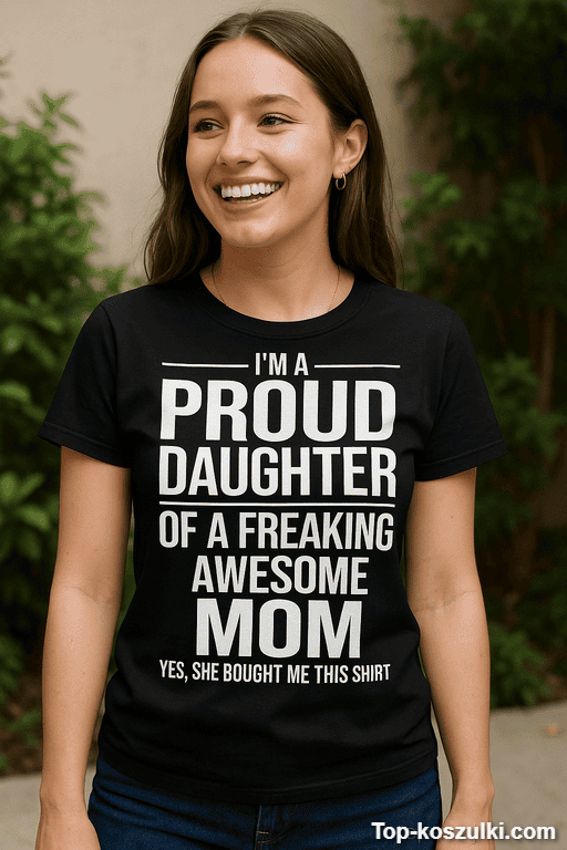 Śmieszna koszulka proud daughter z napisem „I’M A PROUD DAUGHTER OF A FREAKING AWESOME MOM YES, SHE BOUGHT ME THIS SHIRT” to gotowy żart, który robi robotę od pierwszego spojrzenia. Jest bezczelna, ale w tym najlepszym, rodzinnym stylu 😉
