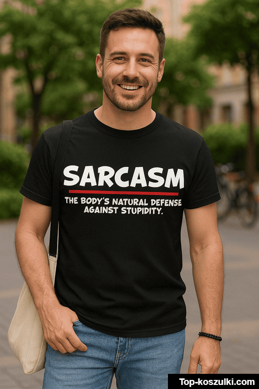 Śmieszna koszulka sarcasm to idealna odpowiedź na pytanie: „co kupić komuś, kto ma cięty język i jeszcze ostrzejszy humor?”. Napis „Sarcasm the body’s natural defense against stupidity” działa jak sygnał ostrzegawczy… i zaproszenie do śmiechu 😄