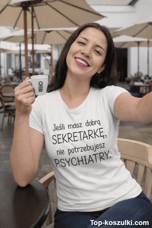 Są dni, kiedy „terapia” wygląda jak ogarnięty kalendarz, odfiltrowane telefony i jedno spojrzenie, które uspokaja cały chaos. Ta koszulka z tekstem „Jeśli masz dobrą SEKRETARKĘ, nie potrzebujesz PSYCHIATRY.” to uśmiech w czystej postaci 😄