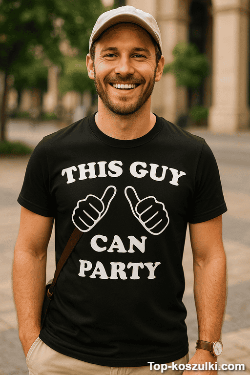 Śmieszna koszulka this guy can party to szybki komunikat dla świata: „tak, ja tu robię klimat”. Zakładasz i od razu wiadomo, kto jest duszą imprezy 😎
