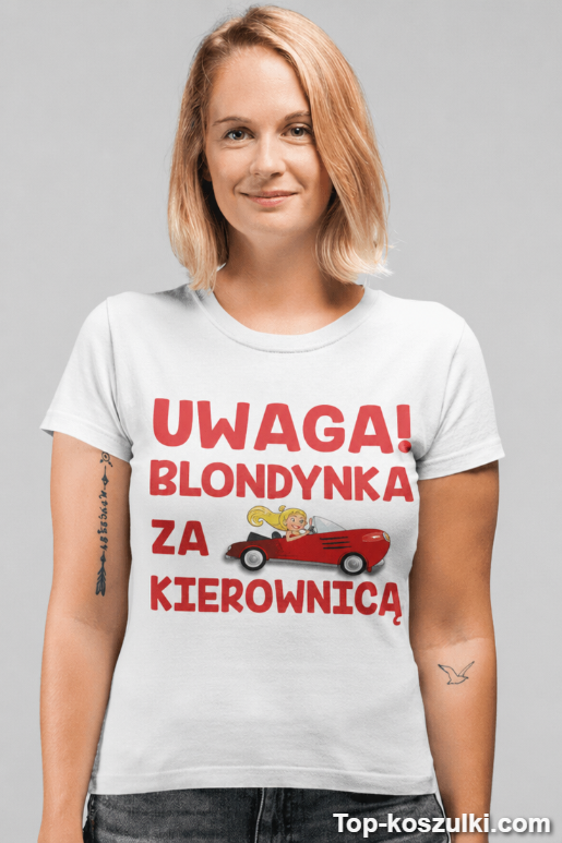 Śmieszna koszulka uwaga blondynka za kierownicą