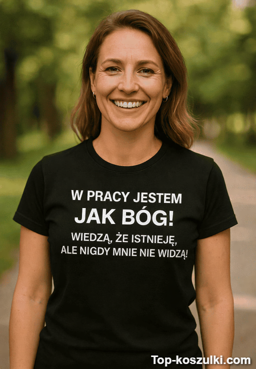 Śmieszna koszulka w pracy jak bóg to idealny tekst dla tych, którzy „są”, ale nikt ich nie widuje. Załóż ją i pozwól, żeby biuro samo dopisało resztę historii 😄