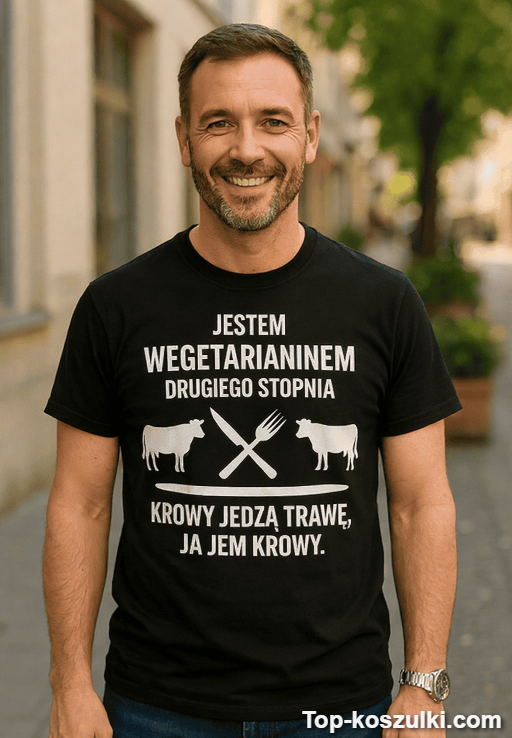 Jeśli szukasz prezentu, który ma pazur i nie udaje grzecznego, ta śmieszna koszulka wegetarianin prezent trafia w punkt. Hasło „JESTEM WEGETARIANINEM DRUGIEGO STOPNIA KROWY JEDZĄ TRAWĘ, JA JEM KROWY.” to idealna zaczepka na imprezę i szybki sposób, żeby rozkręcić rozmowę 😂