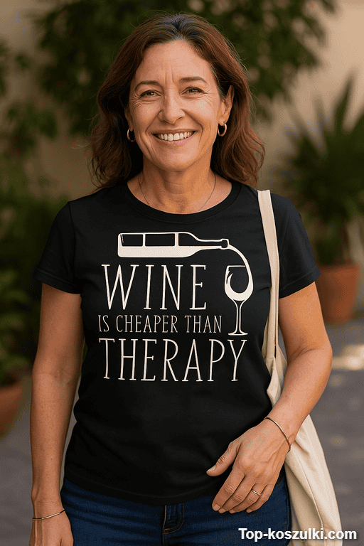 Jeśli Twoje poczucie humoru ma lekko ironiczny posmak, ta śmieszna koszulka wine therapy prezent jest strzałem w dziesiątkę. Napis „WINE IS CHEAPER THAN THERAPY” robi robotę: bawi, prowokuje uśmiech i od razu zdradza, że dystans do życia to Twoja supermoc 😉.