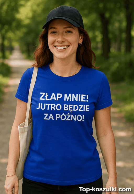 Śmieszna koszulka złap mnie to mały manifest dla tych, którzy lubią żart z nutą bezczelności. Tekst „ZŁAP MNIE! JUTRO BĘDZIE ZA PÓŹNO!” brzmi jak wyzwanie, a jednocześnie zaproszenie do uśmiechu — i dokładnie o to chodzi. 😉
