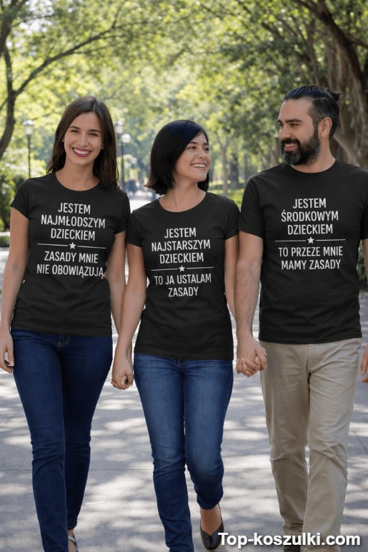 Jeśli szukasz prezentu, który od razu wywoła śmiech i uruchomi klasyczną dyskusję „kto tu rządzi?”, te śmieszne koszulki rodzeństwo zasady robią robotę. Każda sztuka mówi wprost to, co wszyscy i tak wiedzą: najstarszy dowodzi, środkowy miesza, a najmłodszy ma immunitet 😄