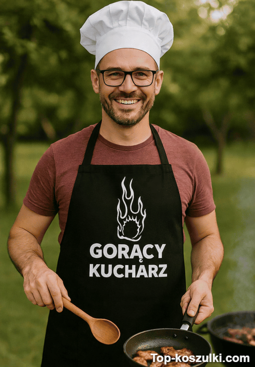 Śmieszny fartuch gorący kucharz z napisem „GORĄCY KUCHARZ” robi wejście mocniejsze niż czosnek na patelni. Idealny, gdy chcesz gotować z przymrużeniem oka i zebrać komplementy zanim podasz obiad. 😄